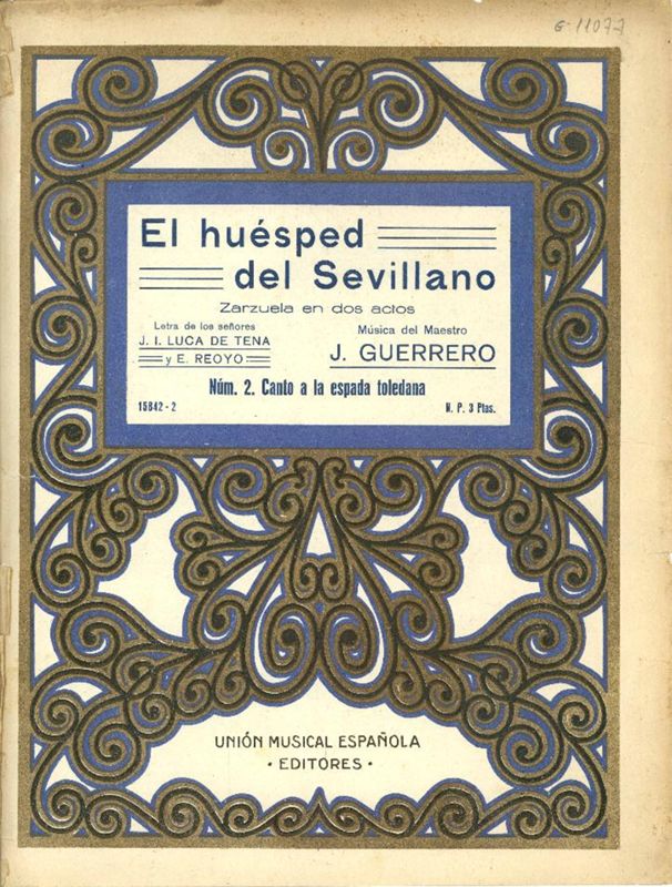El huésped del Sevillano. 1. Introducción. Coro de mozas y espaderos. 2. Canto a la espada toledana. 3. Romanza de Raquel. 4. Dúo de Raquel y Juan Luis. 5. Escena de las feas y los lindos. 6. Final acto 1º. 7. Las Lagarteranas. 8. Duetto cómico. 9. Romanza de Raquel. 10. Romanza de Juan Luis. 11. Chacona. 12. Nocturno y final. Intérpretes: José Simorra (Juan Luis), Lolita Torrentó (Raquel), Oscar Pol (Don Diego), Diego Monjo (Rodrigo), Emilia Aliaga (Constancica / lagarterana), Juan M. Soriano (Huésped del mesón), José M. Parellada (carretero), Fernando Cachadiña (Pregonero), Asunción Serra (Ginesa), Capilla Clásica Polifónica del Fomento de las Artes decorativas, de Barcelona, (director Enrique Ribó), Orquesta Sinfónica Española, director Rafael Ferrer [33 rpm, Regal, 1954]